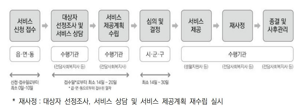 - 연계서비스 : 생활지원(생활용품, 식료품 지원) / 주거개선(주거환경 개선 지원) / 건강지원(의료연계, 건강보조 지원)